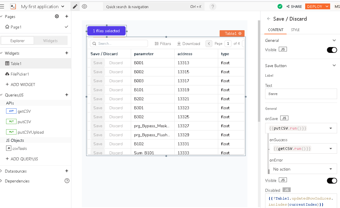 A file uploader is done in a minute (FilePicker and a PUT query), taking care of “Smart JSON” again. Particularly useful is the chaining on query success, so putCSVUpload → onSuccess: getCSV refreshes the table after upload.