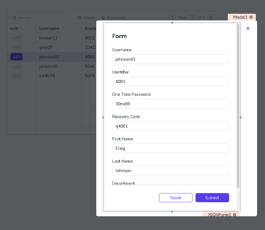 But all is not lost, we still have the original trick up our sleeve: a JSON form with automatic schema generation. So I ditch the built-in editability, make a column with an “edit” button that opens a modal with a JSON form, and PUT the updated CSV on submit. Extra trick, make the “edit” disabled except for the selected row.