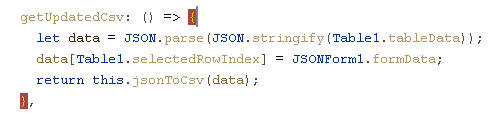“header1,header2, header3\ncol1,col2,col2”including the quotes and backslash n. This was caused by a “feature” called “Smart JSON substitution”, which “adds quotes to reduce developer errors”. After losing some time and deactivating it, I successfully update the CSV.This seems to work again, but only the first time. The problem is similar to the table issue above: “JS object” variables are not reactive states. Once I figure this out, and code the CSV update in functional style, everything works nicely. This leads me to wonder what the point of JS object variables is anyway - I must not be using them correctly.