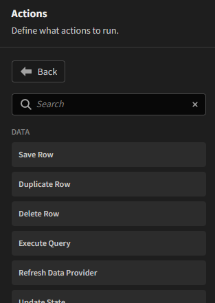 However at this point it is already clear for me that I am not the target population of Budibase. It has a lot more predefined structure and order than Openblocks. From my understanding, Budibase is a system to build a complete app with as little code as possible and as much support from the framework as possible (see below: actions on a button). I am looking for a way to make a quick frontend by drag&drop and make it do what I want. It’s probably possible to make “my app” in Budibase, but I will work around the system rather than with it.